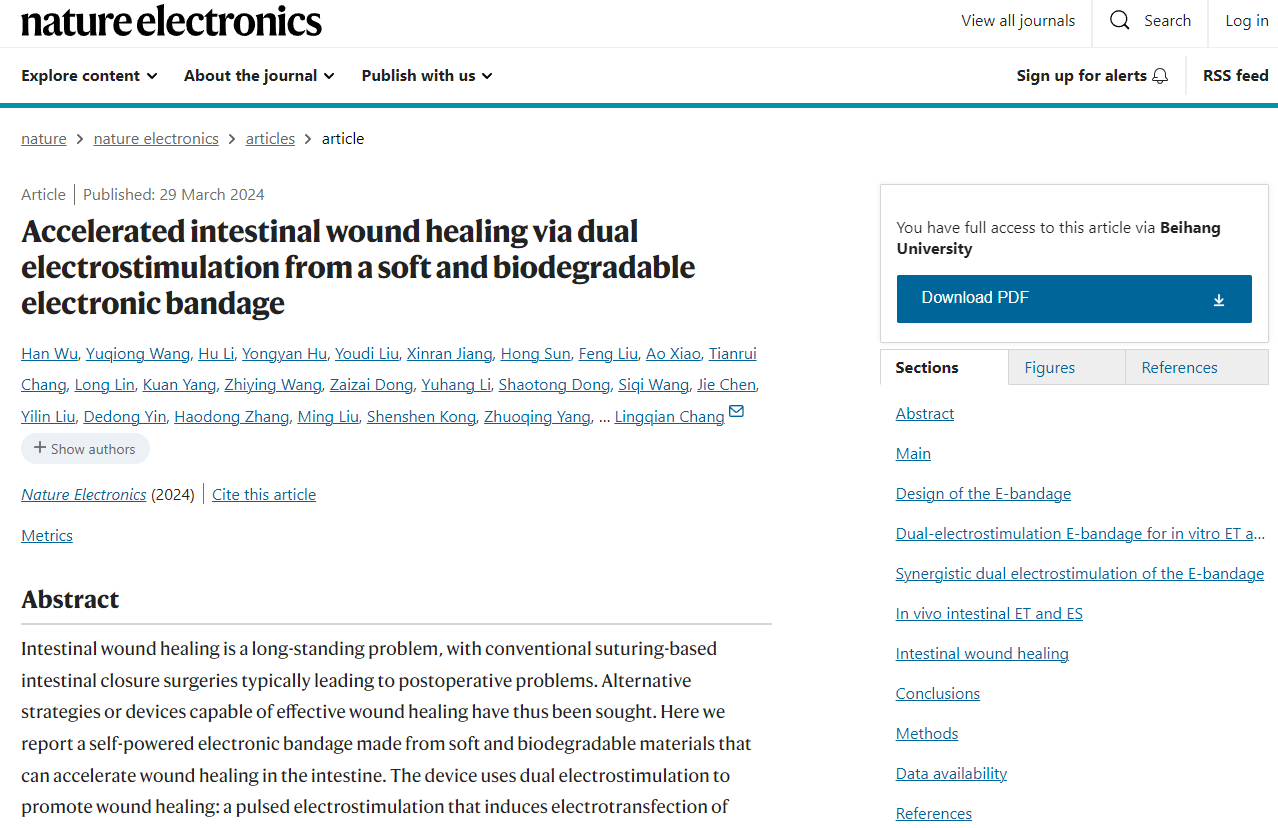 3月29日,常凌乾教授團隊報道了一種柔性、可生物降解、自供電電子繃帶,能夠提供雙模式電刺激,協(xié)同加速和改善腸道傷口愈合,并顯著減少了術后并發(fā)癥。相關成果以“Accelerated intestinal wound healing via dual electrostimulation from a soft and biodegradable electronic bandage”為題,發(fā)表在《Nature Electronics》上。北航生物與醫(yī)學工程學院博士生吳晗、王玉瓊博士、李虎博士等為第一作者,北航常凌乾教授、王柳助理教授,賓夕法尼亞州立大學余存江教授為通訊作者,北京航空航天大學為第一單位。