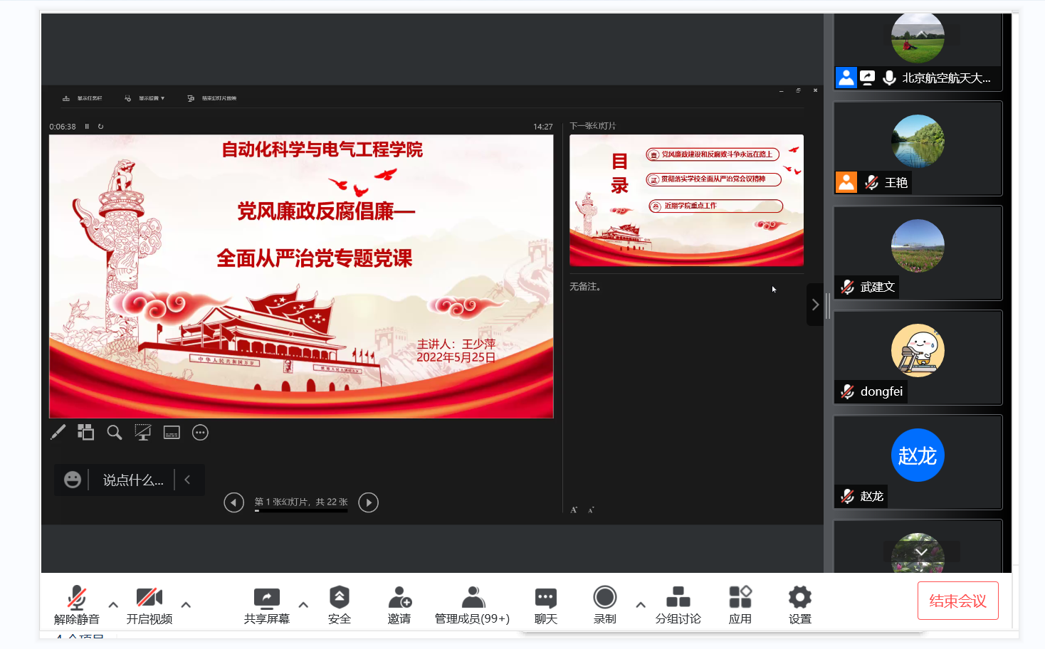 2022年5月25日自動(dòng)化科學(xué)與電氣工程學(xué)院黨委書記王少萍做了“從嚴(yán)治黨暨黨風(fēng)廉政建設(shè)”專題黨課。會(huì)議以線上騰訊視頻會(huì)議方式進(jìn)行,學(xué)院全體教職工參加了本次集體學(xué)習(xí)活動(dòng)。
